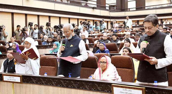 কাউন্সিলরদের শপথ বাক্য পাঠ করান স্থানীয় সরকার, পল্লী উন্নয়ন ও সমবায় মন্ত্রী মো. তাজুল ইসলাম।