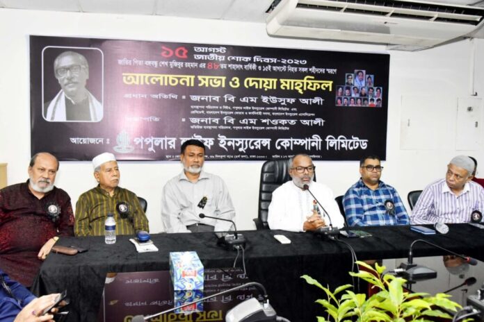 নিউজ ডেস্ক : পপুলার লাইফ ইনস্যুরেন্স কোম্পানী লিমিটেড এর উদ্যোগে জাতির পিতা বঙ্গবন্ধু শেখ মুজিবুর রহমান এর ৪৮তম শাহাদাৎ বার্ষিকী ও ১৫ই আগস্টে নিহত সকল শহিদদের স্মরণে আলোচনা সভা ও দোয়া মাহ্ফিল কোম্পানীর সেমিনার কক্ষে অনুষ্ঠিত হয়। অনুষ্ঠানে প্রধান অতিথি ছিলেন কোম্পানীর ব্যবস্থাপনা পরিচালক ও সিইও এবং বাংলাদেশ ইনস্যুরেন্স ফোরামের প্রেসিডেন্ট বি এম ইউসুফ আলী।