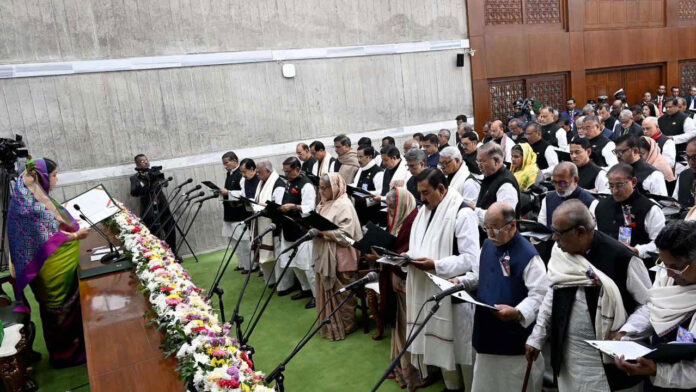 নিউজ ডেস্ক : শপথবাক্য পাঠ করেছেন দ্বাদশ জাতীয় সংসদে আওয়ামী লীগের নবনির্বাচিত সংসদ সদস্যরা। বুধবার (১০ জানুয়ারি) সকালে শেরেবাংলা নগরের সংসদ ভবনের পূর্ব ব্লকের প্রথম লেভেলের শপথ কক্ষে এ শপথ অনুষ্ঠিত হয়। স্পিকার ড. শিরীন শারমিন চৌধুরী তাদের শপথবাক্য পাঠ করান। এর আগে নিয়মানুযায়ী স্পিকার নিজে নিজেই শপথ গ্রহণ করেন।