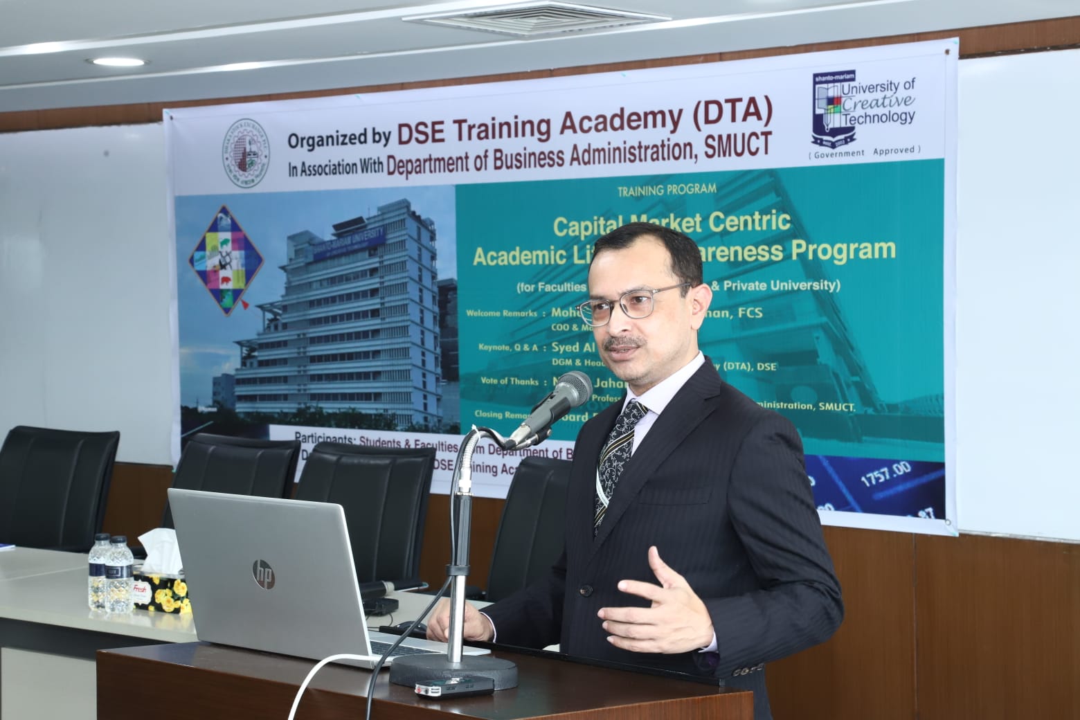 তার আগে পাবলিক ও প্রাইভেট ইউনিভার্টির শিক্ষক ও ছাত্রছাত্রীদের জন্য পুঁজিবাজার কেন্দ্রিক একাডেমী শিক্ষা ও সচেতনতামূলক ধারাবাহিক এই কর্মশালার শুরুতেই ডিএসই’র প্রধান প্রযুক্তি কর্মকর্তা ড. মো: আসিফুর রহমান সকলকে স্বাগত জানিয়ে বলেন, শিক্ষাথীরাই দেশের ভবিষ্যতে নেতৃত্ব দেবে৷ বর্তমান প্রযুক্তি নির্ভর বিশ্বে প্রযুক্তি ভিত্তিক মানবিক মানুষ তৈরিতে কলেজ বা বিশ্ববিদ্যালয়গুলোকে অগ্রণী ভুমিকা পালন করতে হবে। শিক্ষার্থীরা সবসময় নতুন কিছু শেখার প্রতি আগ্রহী থাকে৷ আর নতুনদের হাত ধরেই উন্মোচিত হয় সম্ভাবনার এক নতুন দিগন্ত৷ আজকের এ আয়োজন পুঁজিবাজারের তথ্য প্রযুক্তিসহ সামগ্রিক কার্যক্রম সম্পর্কে প্রাকটিক্যালভাবে জানার একটি বড় সুযোগ। বিশ্বজুড়ে পুঁজিবাজার এখন প্রযুক্তিনির্ভর। ডিএসইও এর ব্যতিক্রম নয়। আমরা প্রতিনিয়ত আমাদের ট্রেডিং প্ল্যাটফর্ম, ক্লিয়ারিং অ্যান্ড সেটেলমেন্ট সিস্টেম, সার্ভেইলেন্স ও সাইবার সিকিউরিটি ফ্রেমওয়ার্ক আরও উন্নত করার লক্ষ্যে কাজ করছি। প্রযুক্তির ব্যবহার কেবল লেনদেনের গতি ও নির্ভরযোগ্যতা নিশ্চিত করে না, এটি বাজারের স্বচ্ছতা ও বিনিয়োগকারীর আস্থাও বাড়ায়। আজকের এই প্রোগামে যা জানা যাবে তা বিশ্ববিদ্যালয়ের শিক্ষকদের জন্য যেমন কাজে আসবে, তেমনি ছাত্রছাত্রীদের জন্যও কাজে আসবে বলে আমি মনে করি।