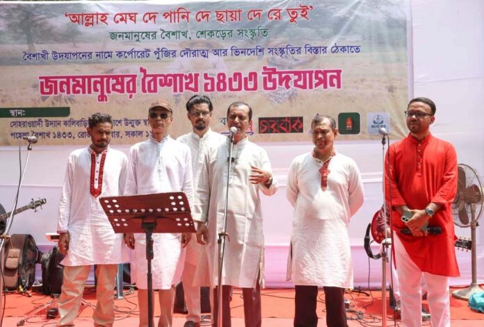 বৈশাখ উদযাপনের নামে কর্পোরেট পুঁজির দৌরাত্ম আর ভিনদেশী সংস্কৃতির বিস্তার ঠেকাতে কবি ও চিন্তক ফয়েজ আলমের নেতৃত্বে পাঁচটি সংগঠনের যৌথ উদ্যোগে ‘জনমানুষের বৈশাখ, শেকড়ের সংস্কৃতি’ শিরোনামে পহেলা বৈশাখ ১৪৩৩ উদযাপিত হয়েছে রাজধানীর সোহরাওয়ার্দী উদ্যানে।